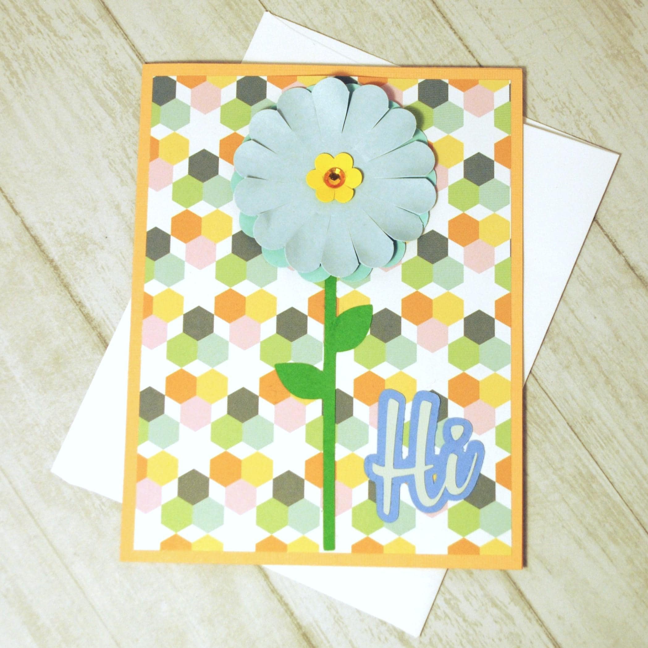 * A tall single flower in 2 shades of blue, raised petals, yellow center with jewel