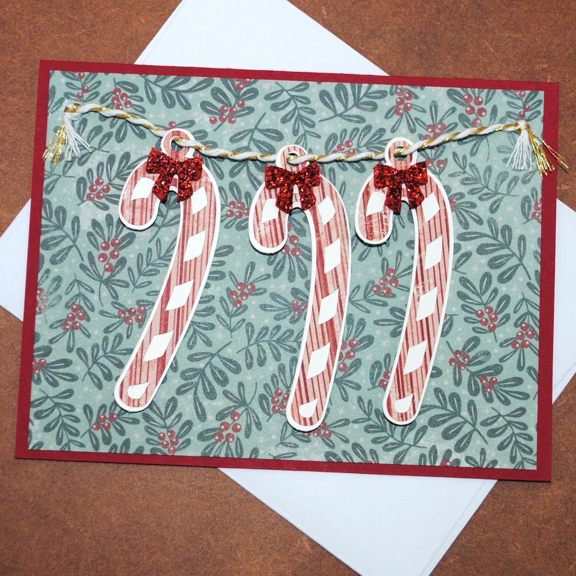 Beautiful 3-dimensional card of a hanging garland of candy canes that move. Perfect for wishing someone a Merry Christmas or Happy Holidays!