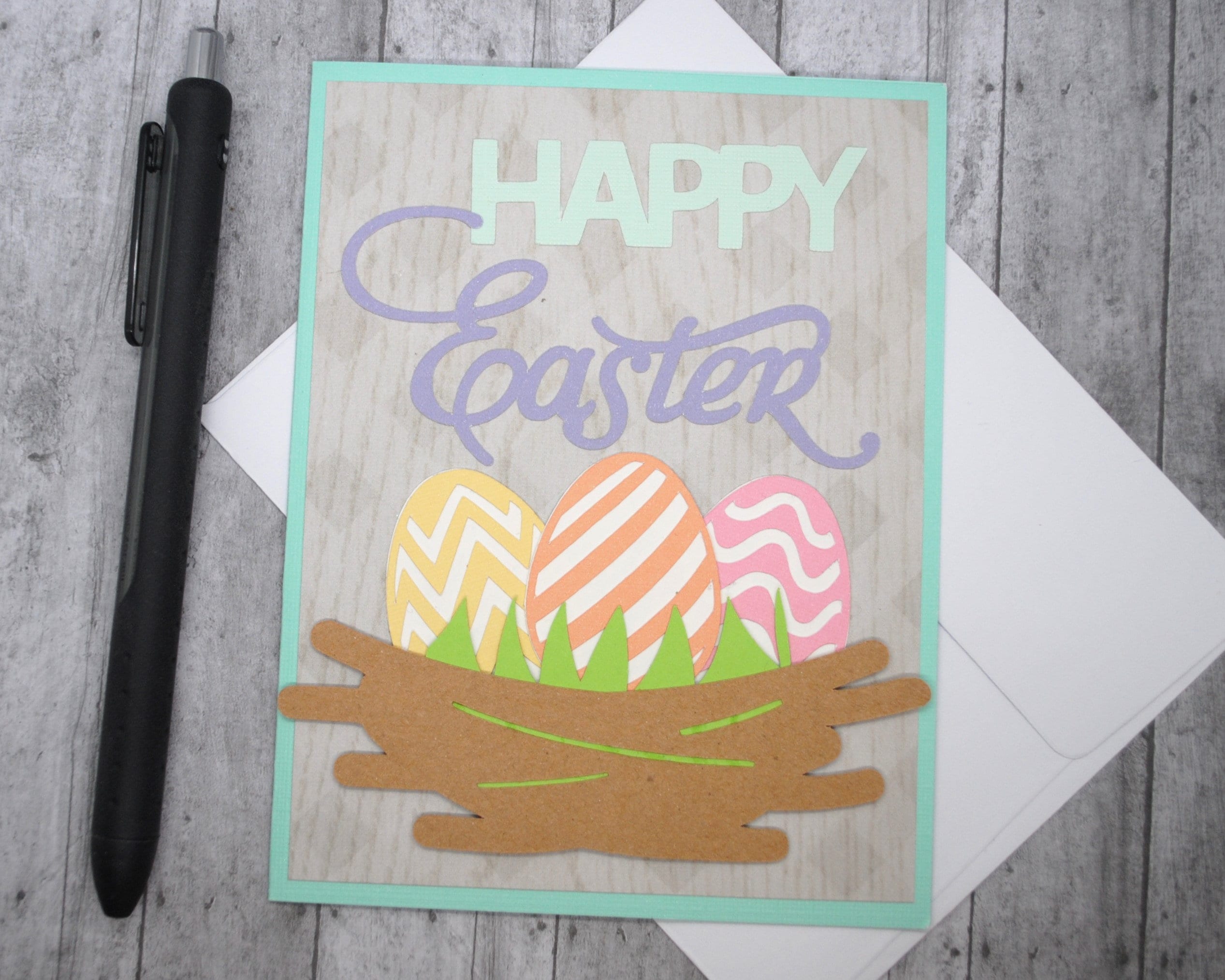 Adorable Easter card perfect for anyone this Easter season. Features a bird nest with colorful, patterned eggs.