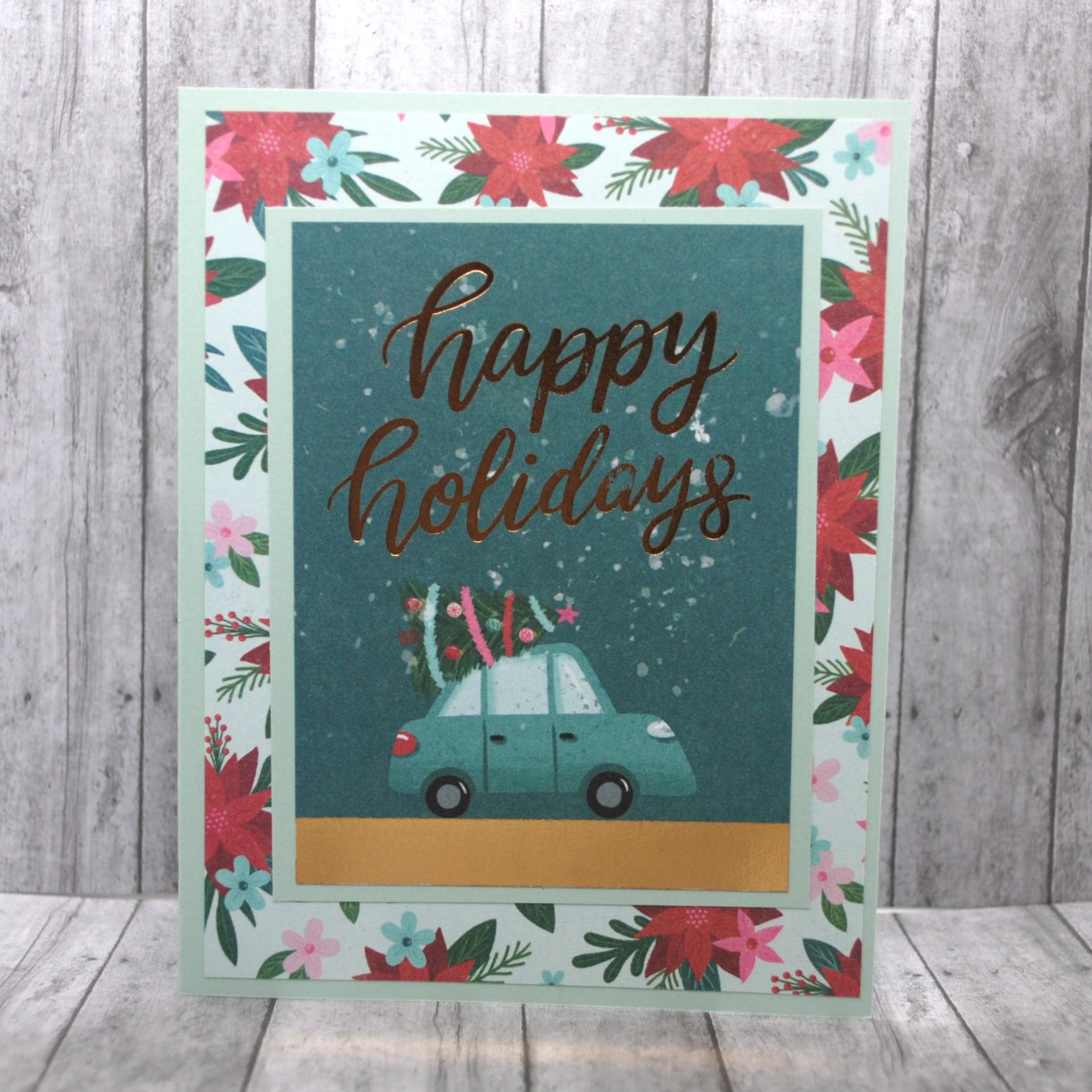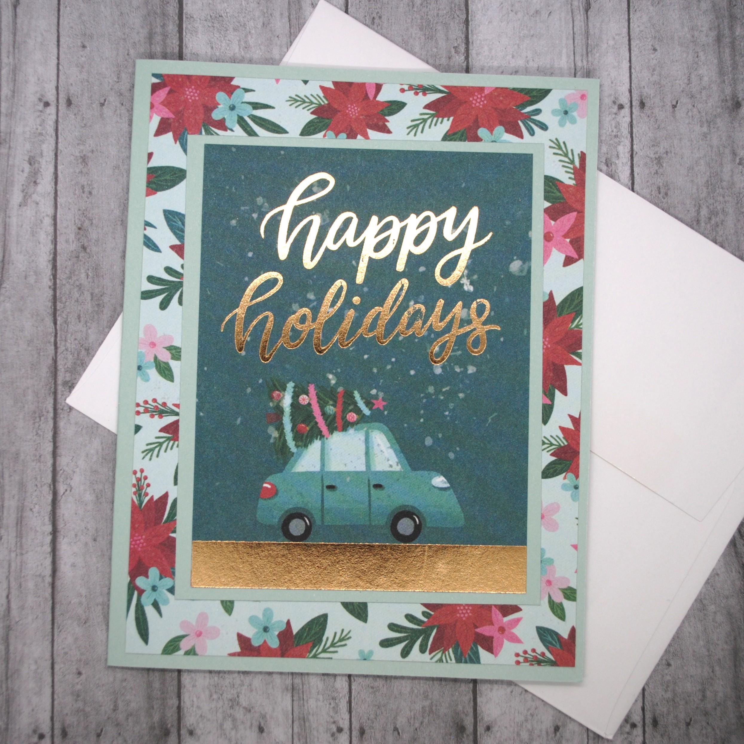 * "Happy Holidays" in gold foil above a small blue car with a decorated Christmas tree on top and a big gold foil stripe at the bottom.