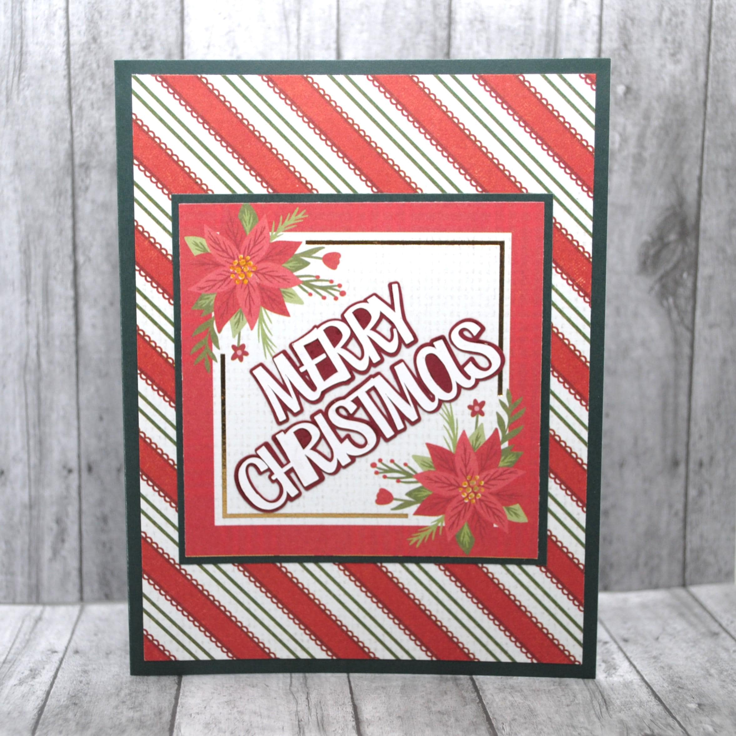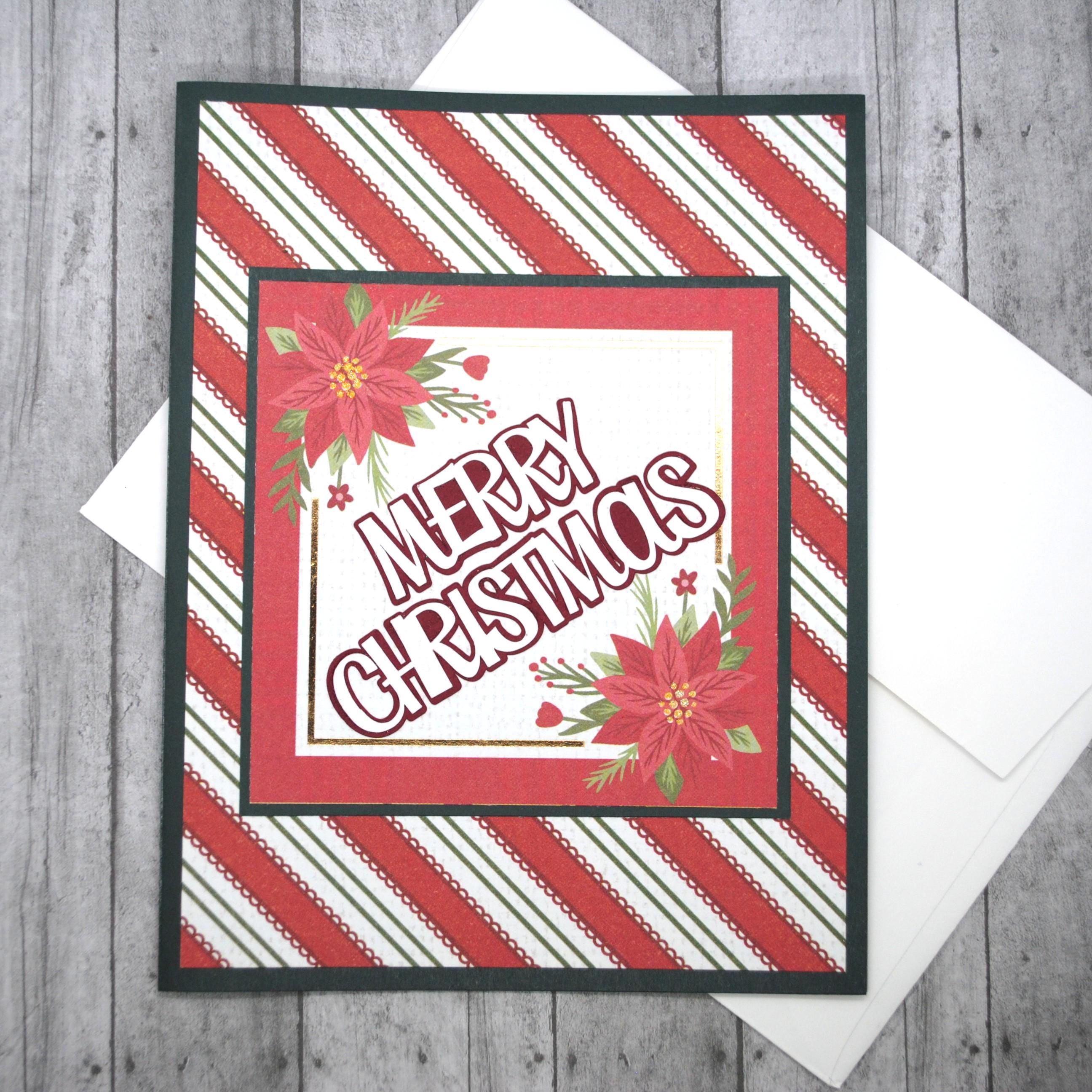 * a square of white and red, with prints of a poinsettia flower in opposite corners, with gold ink centers