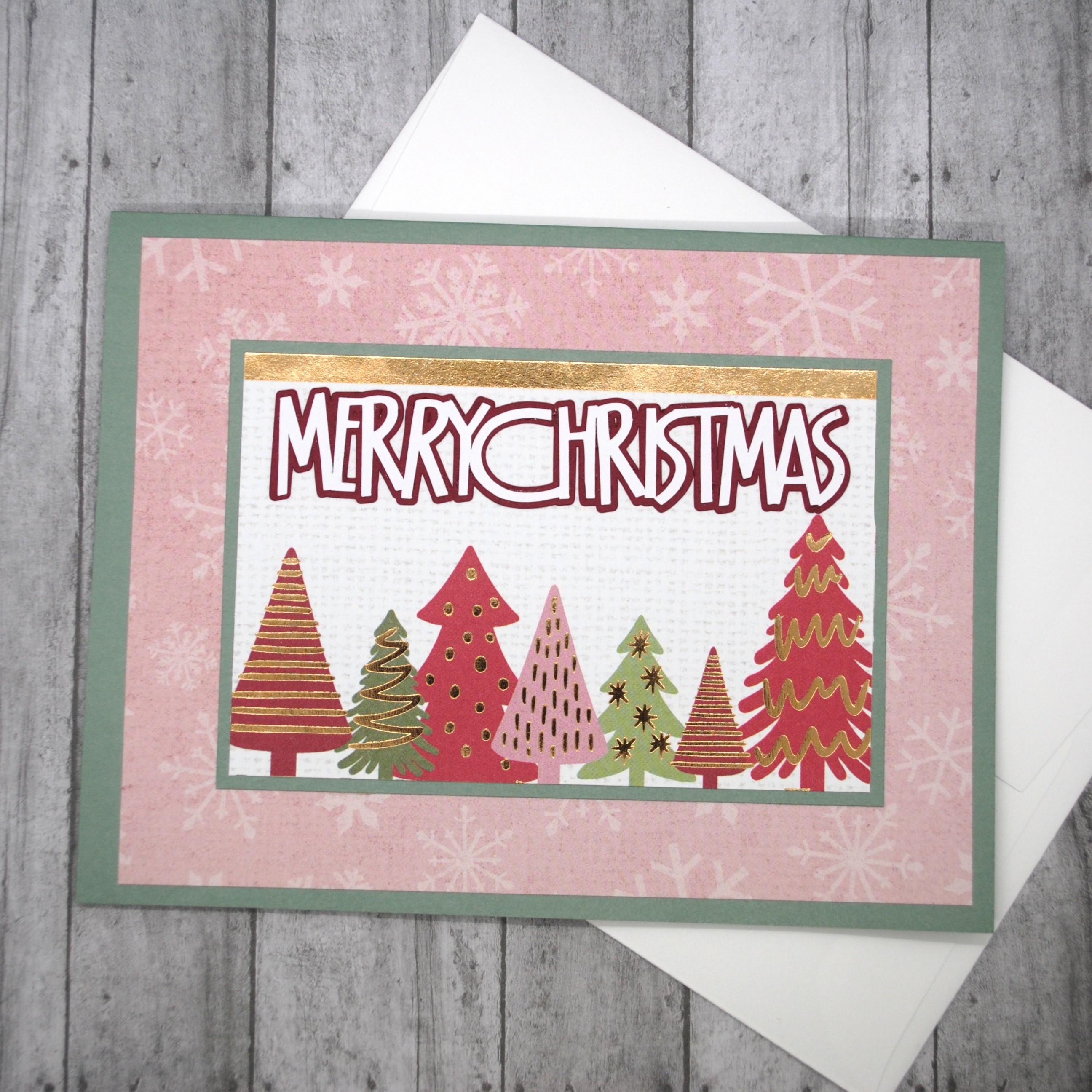 * "Merry Christmas" cutout in red and white cardstock, under a gold foil bar