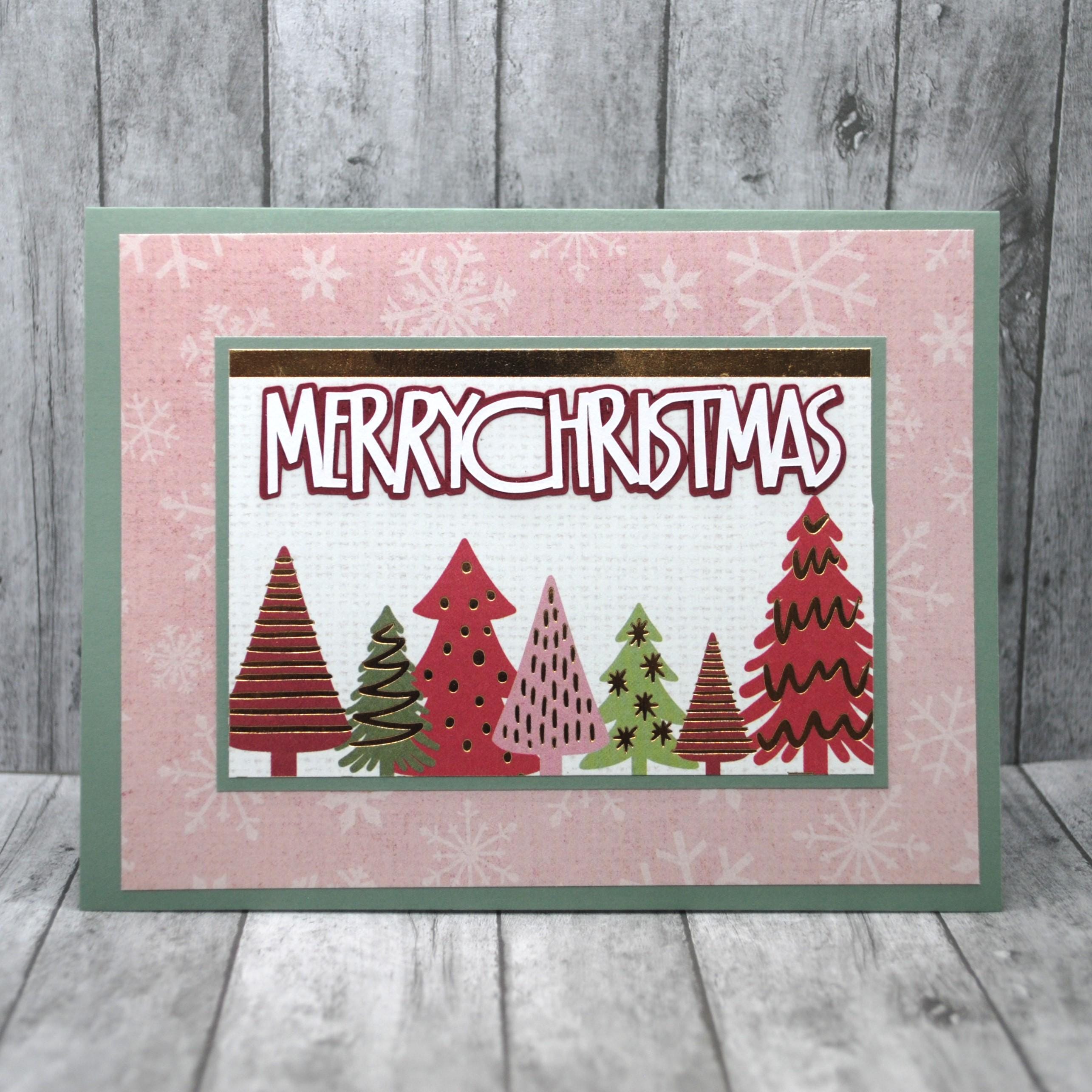 * a print of small red and green trees with gold foil sit at the bottom