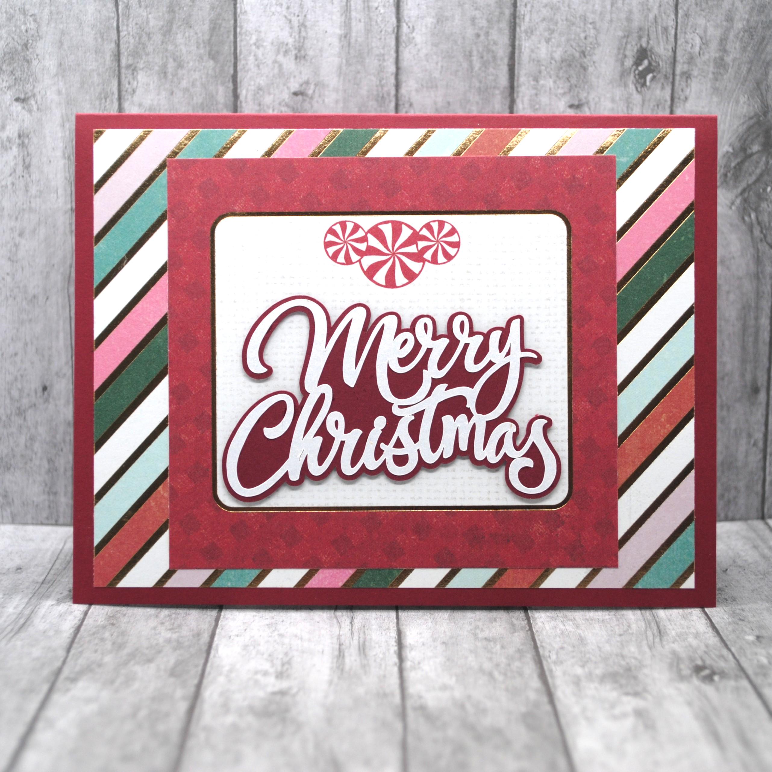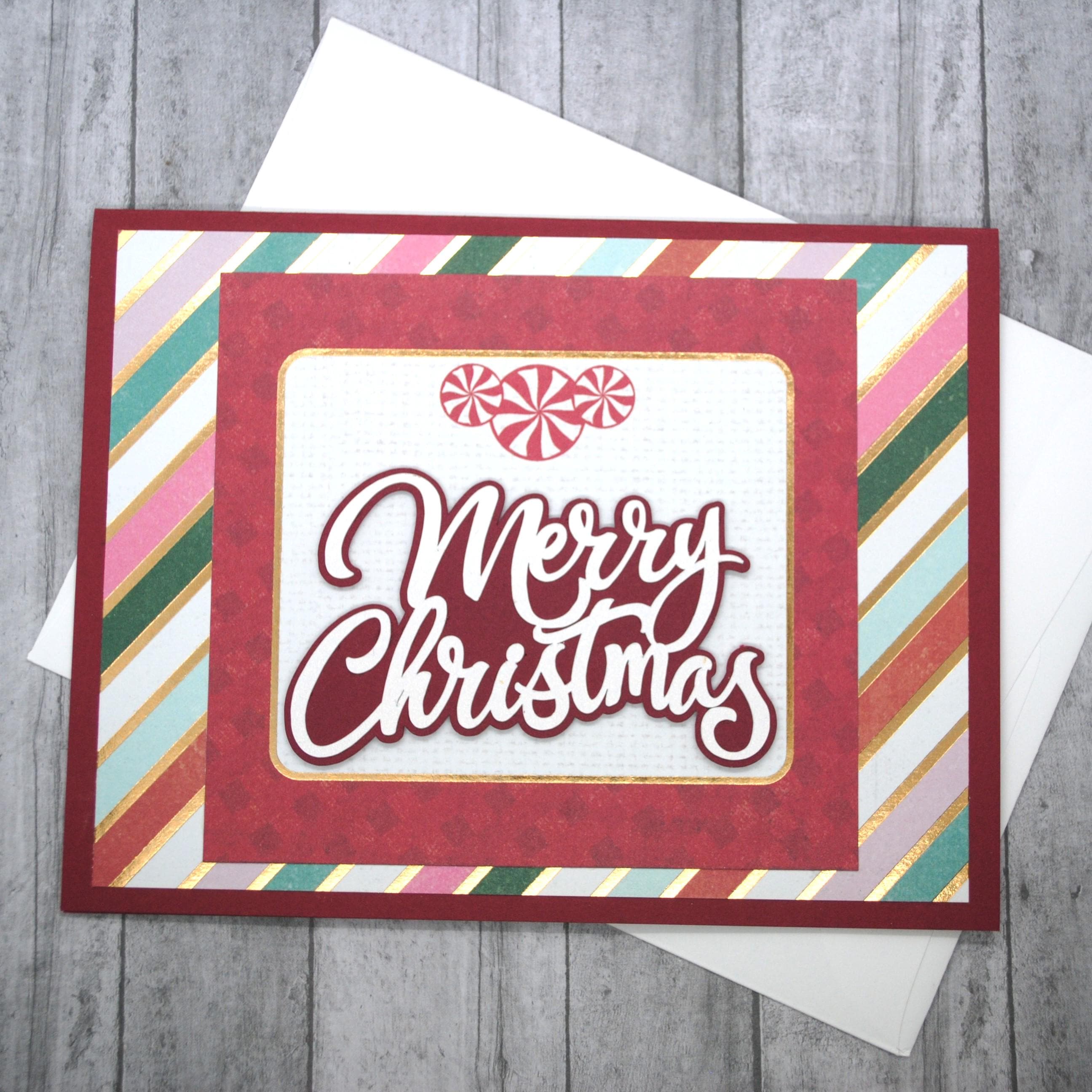* phrase sits on a white print rectangle with gold foil and red border, and peppermint candy accents on top