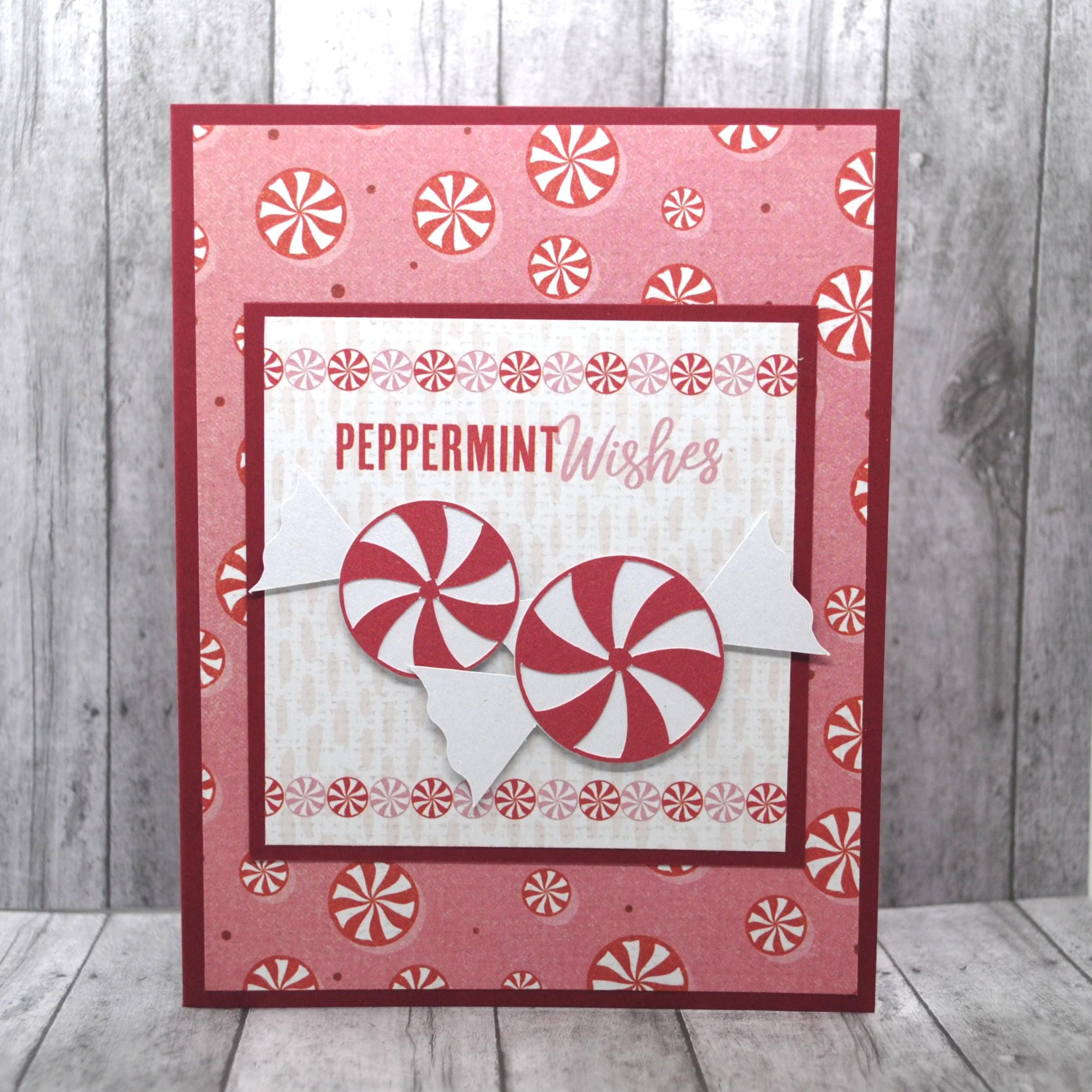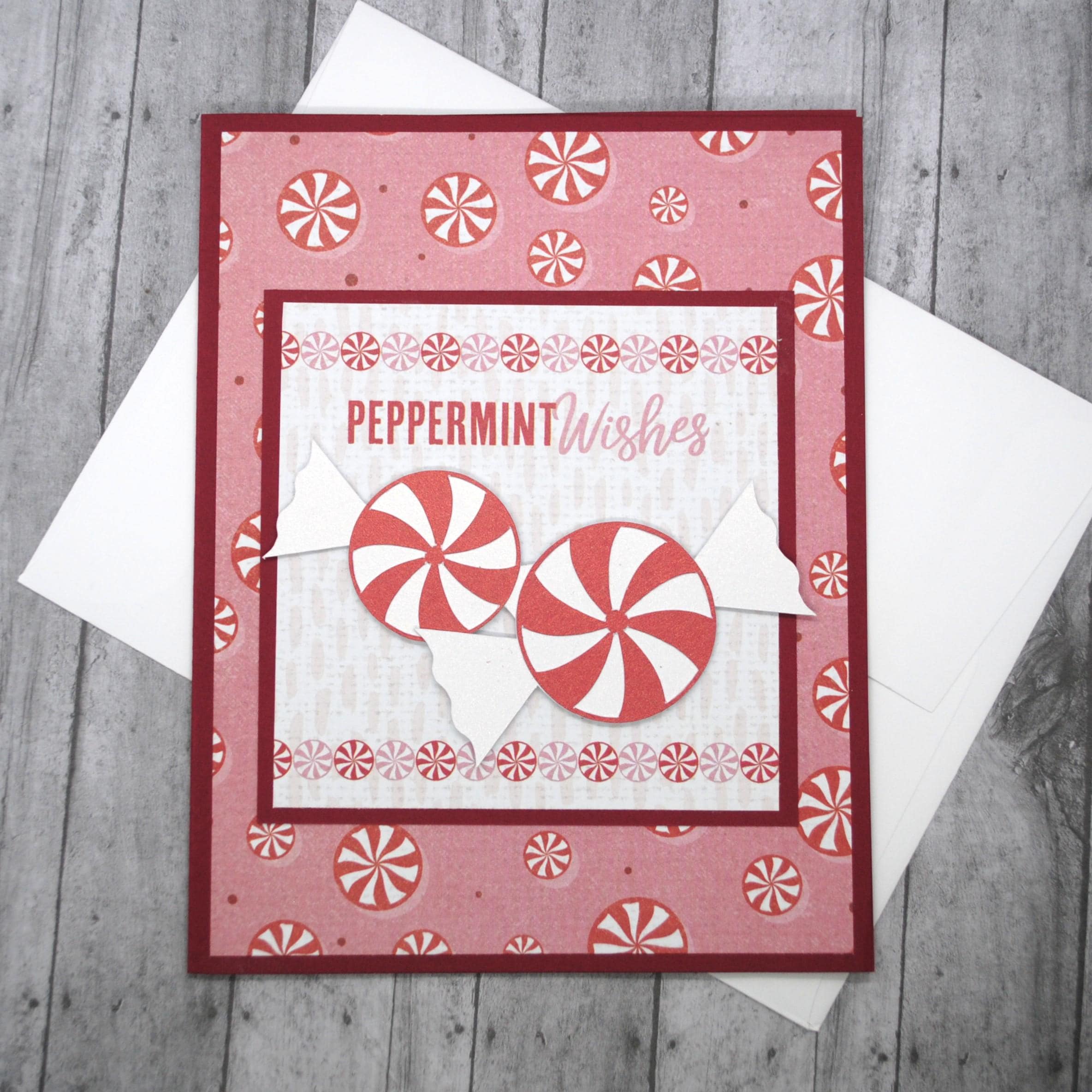 * "Peppermint wishes" printed on a white square with light pink lines, on red cardstock. Small round peppermint candies in red and pink printed in a top and bottom border