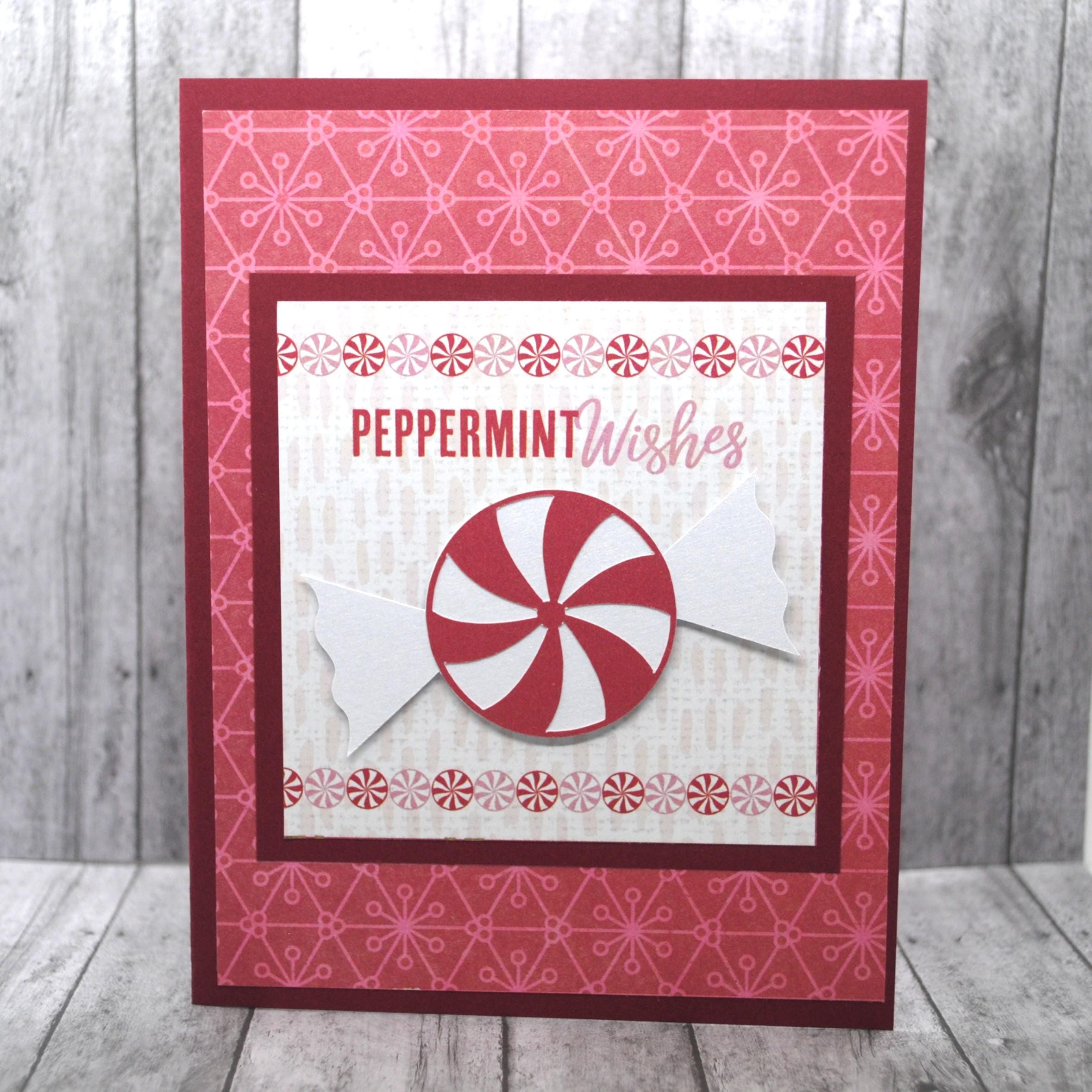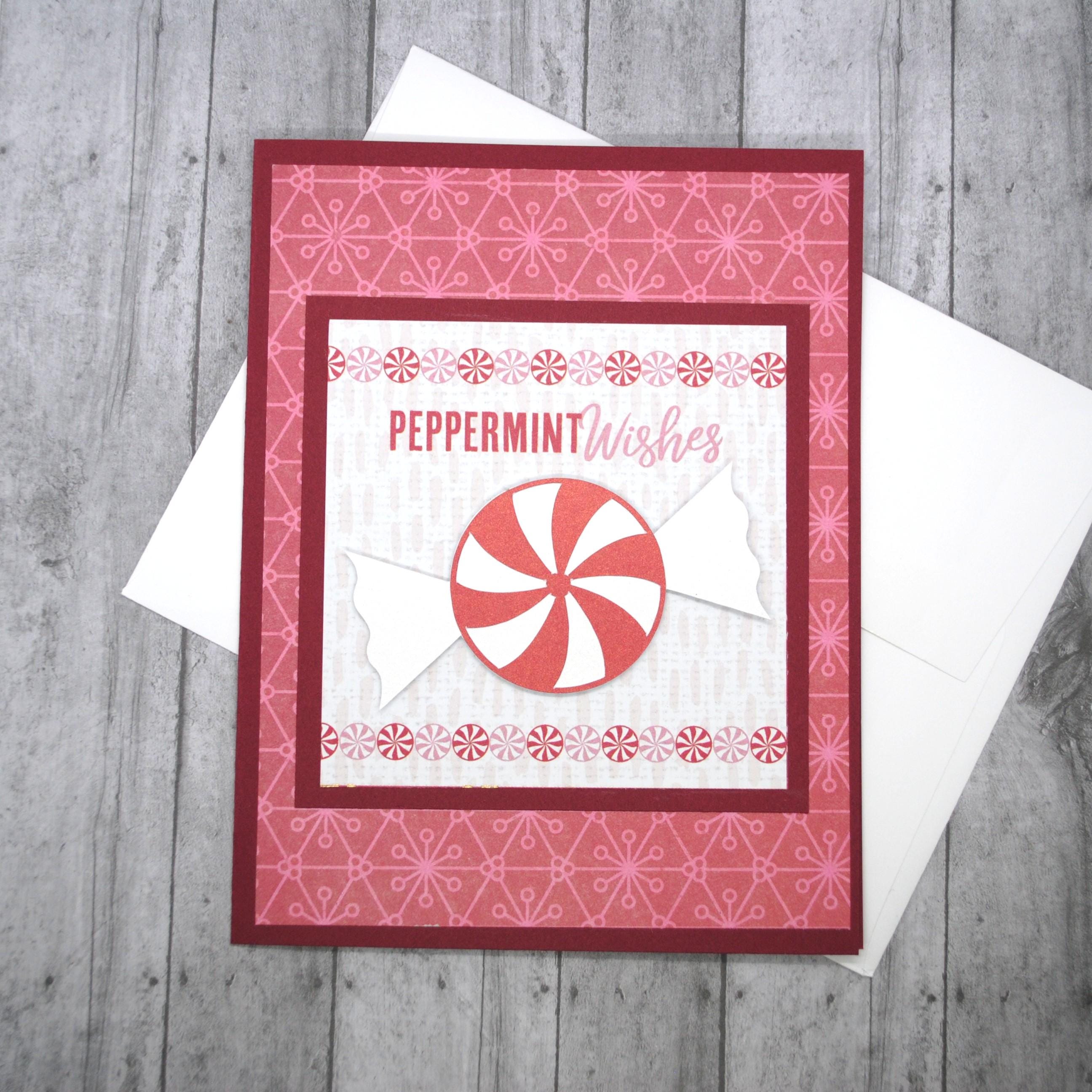 * "Peppermint wishes" printed on a white square with light pink lines, on red cardstock. Small round peppermint candies in red and pink printed in a top and bottom border