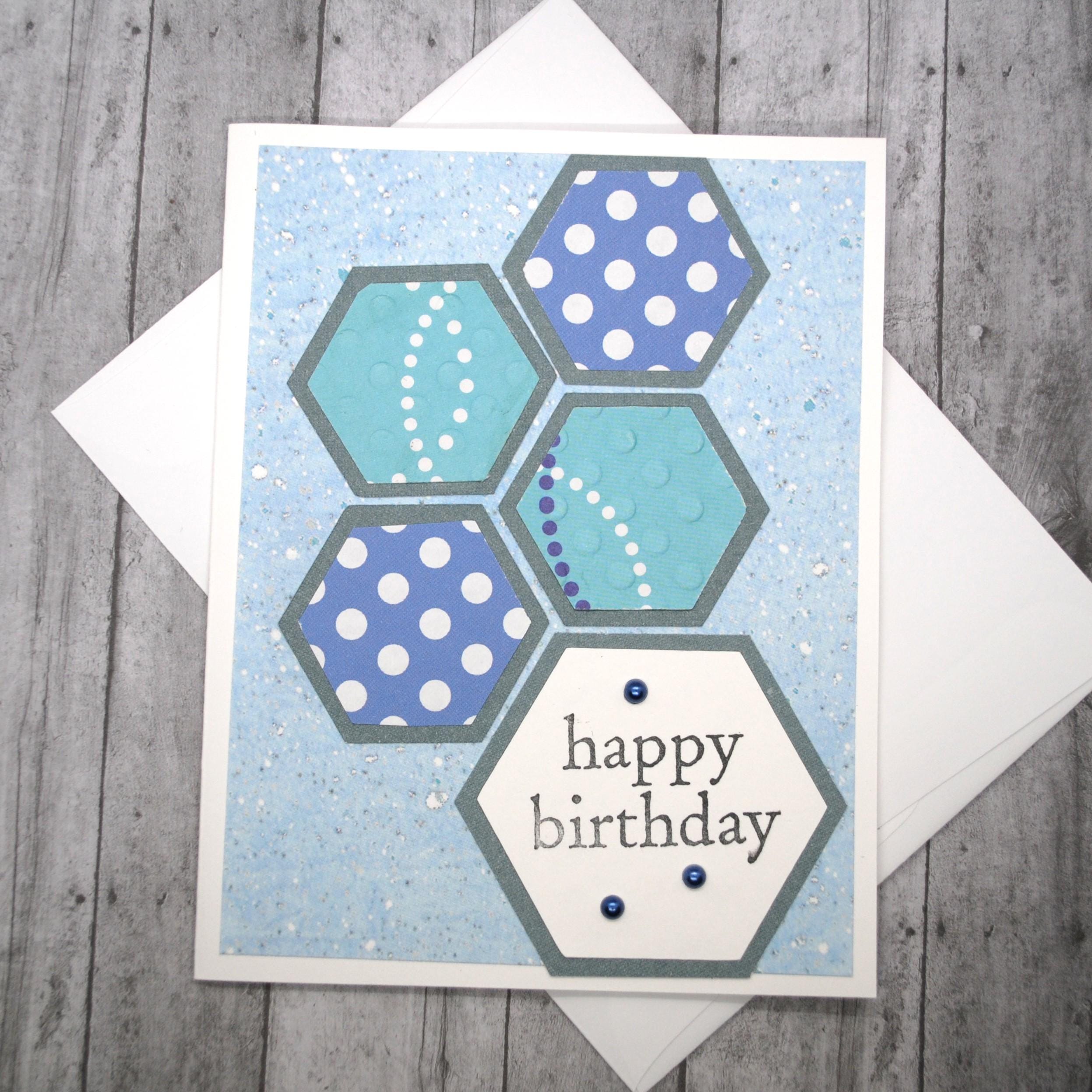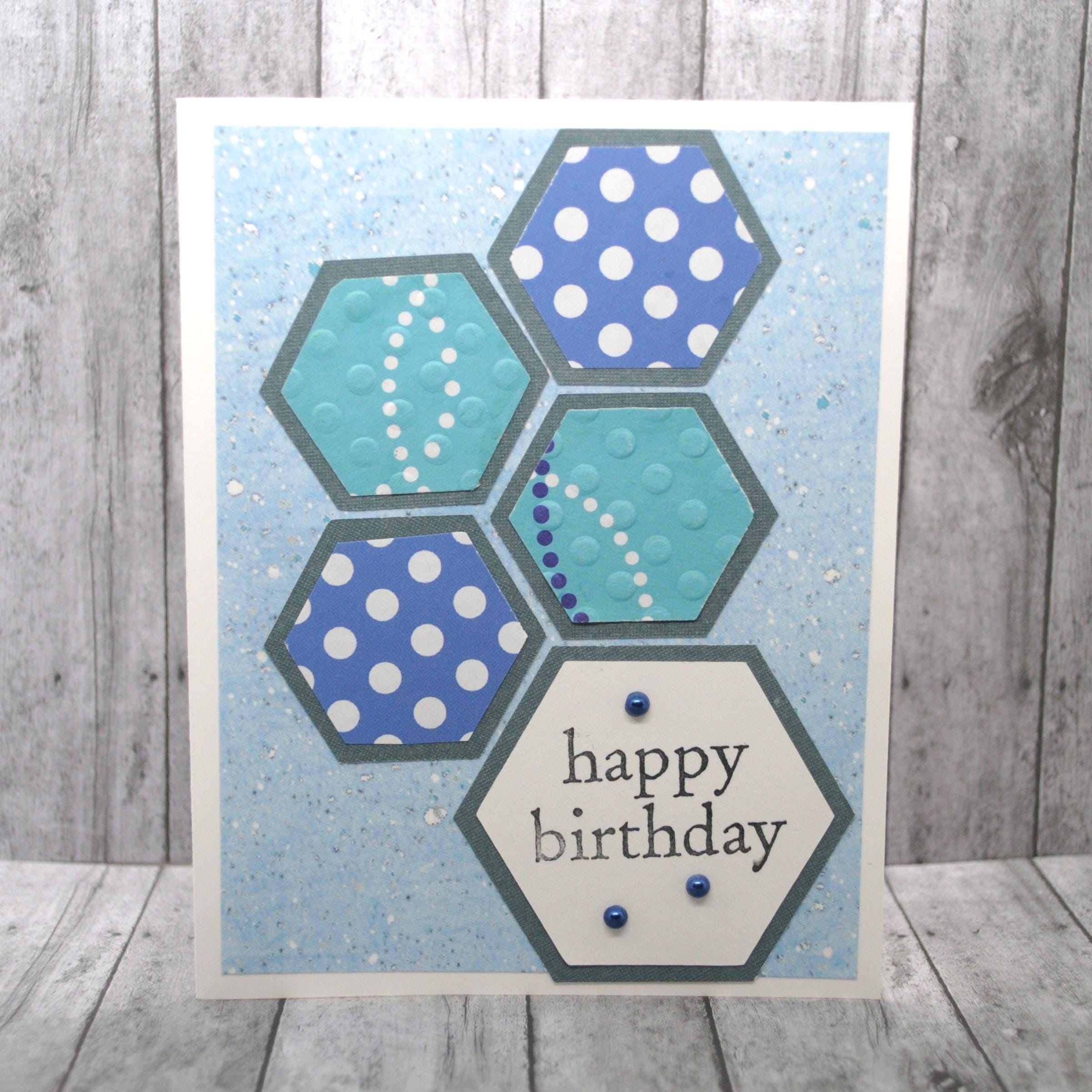 Simple birthday card in patterns of blue hexagons. Features a speckled blue background and hexagons in polka dotted patterns & embossing.
