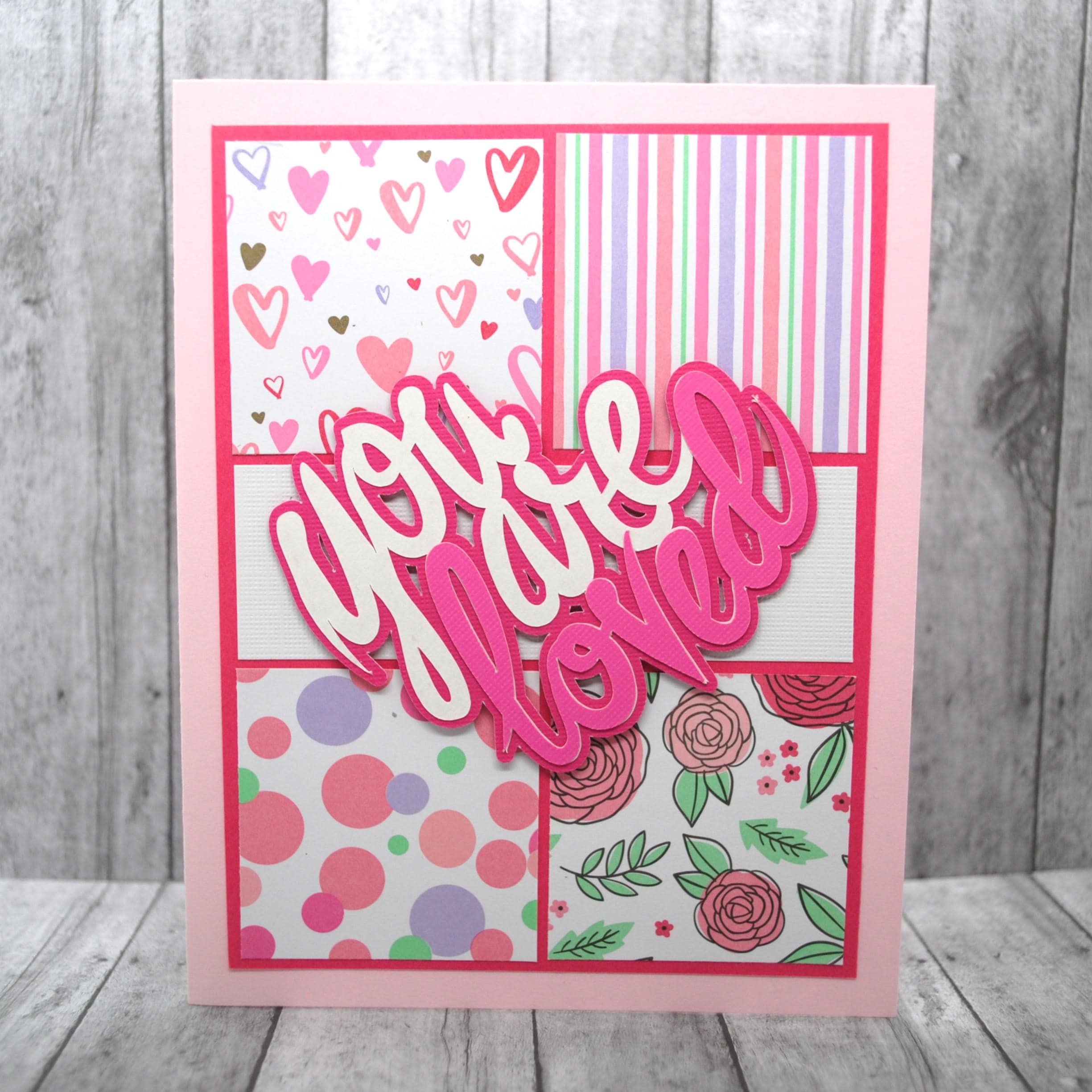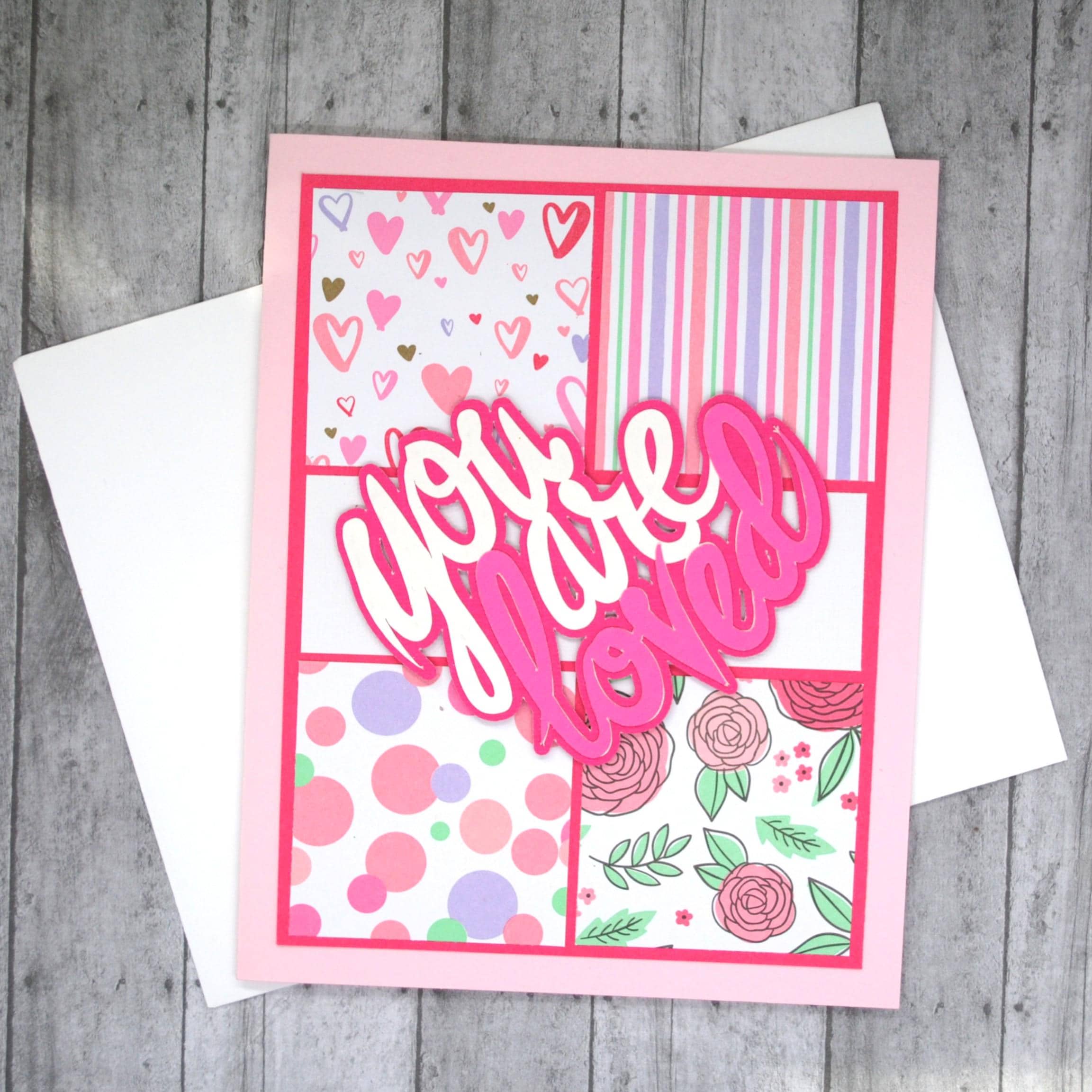 Let someone know they are loved with this card perfect for Valentine's, anniversary, or just because. Features "you are loved" centered over squares of various patterns in pinks, purples & greens.