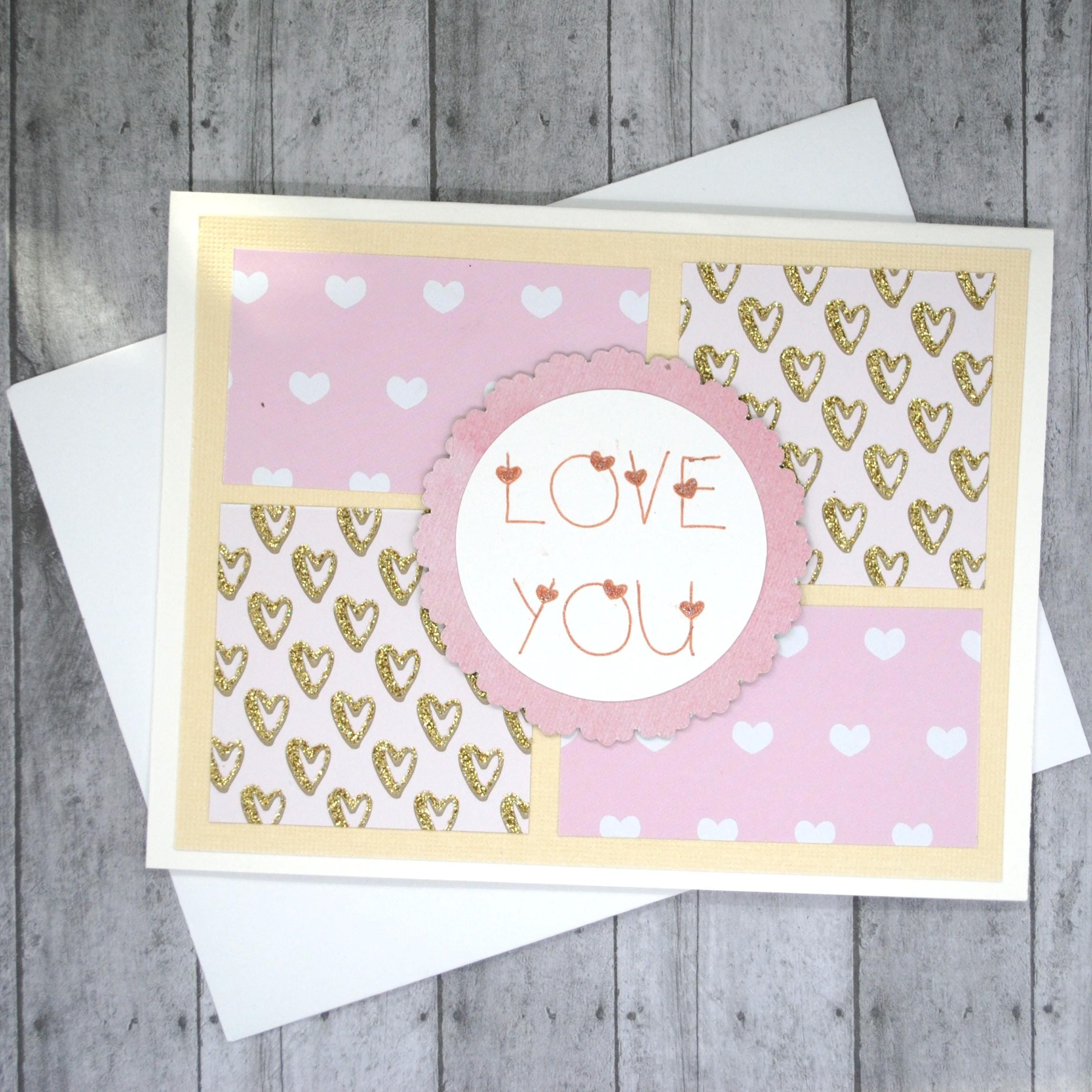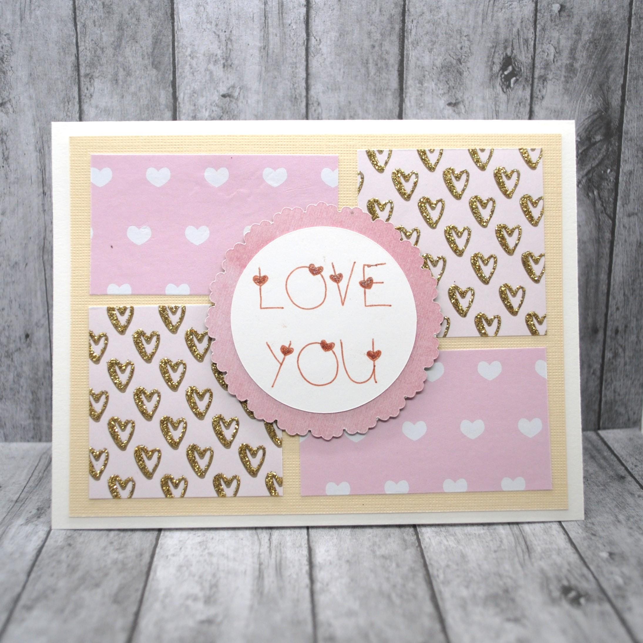 Pretty love-themed card perfect for Valentine's, anniversary, or just because. Features "love you" in copper ink, with squares of pink & white heart patterned paper.