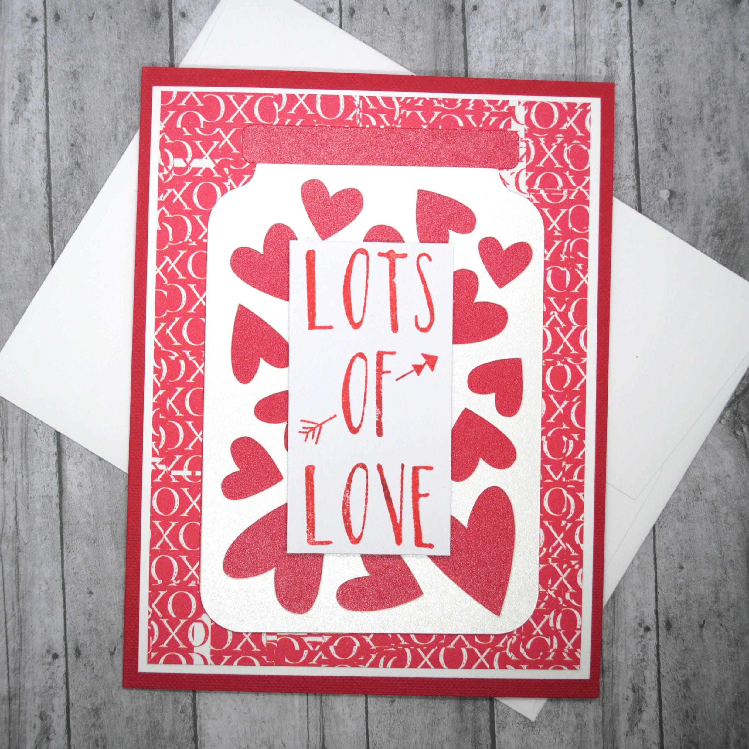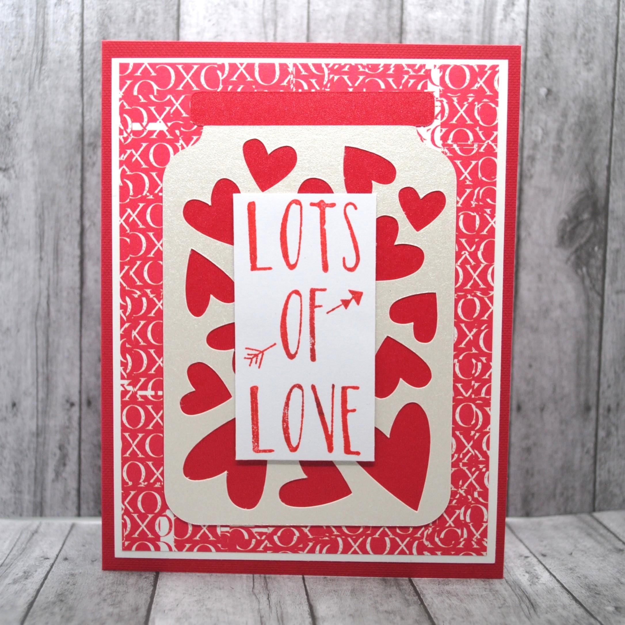 Cute heart card perfect for Valentine's, anniversary, or just because. Features "Lots of Love" stamped on a white jar of red hearts, made from shimmery cardstock. Background is small XOXO pattern in white on red.