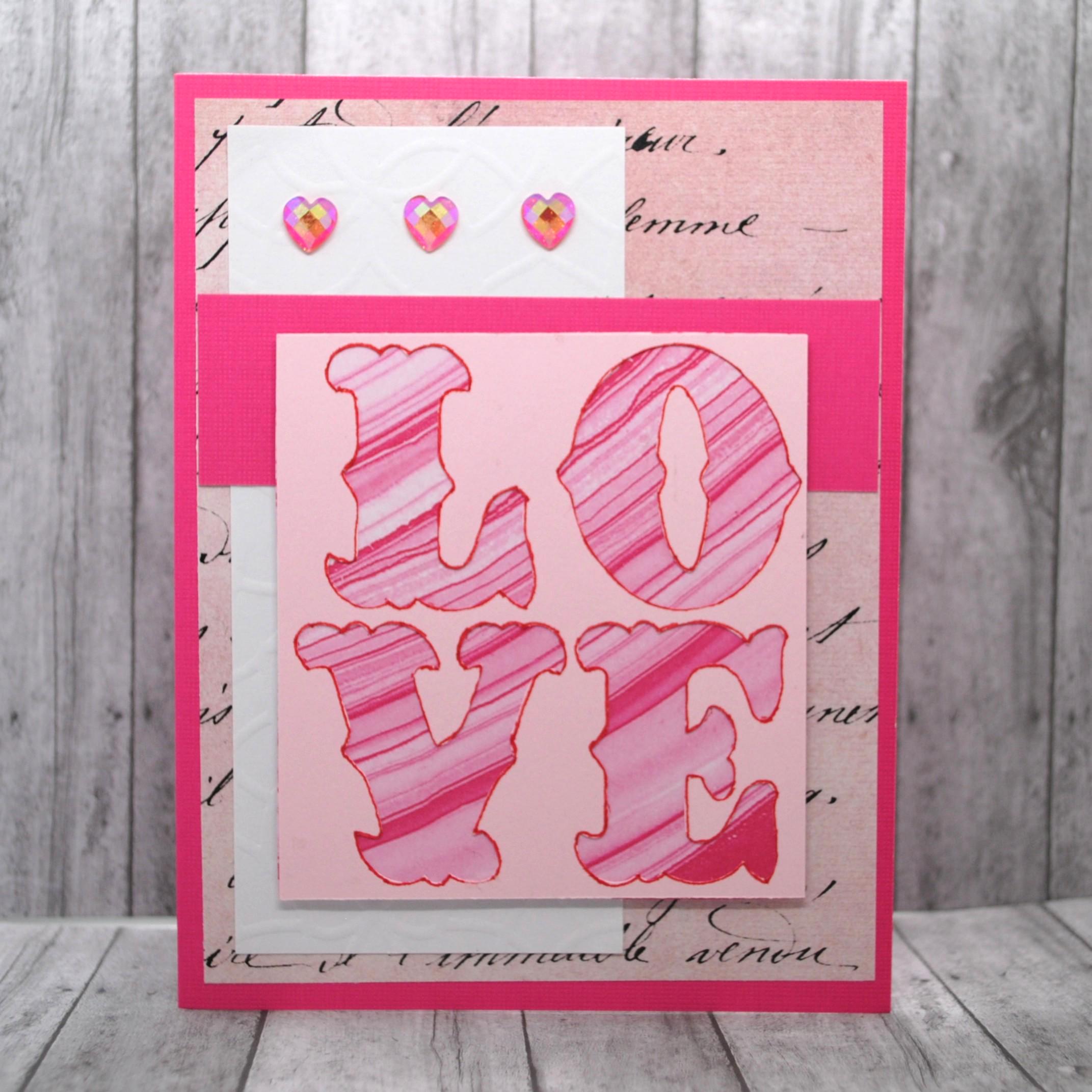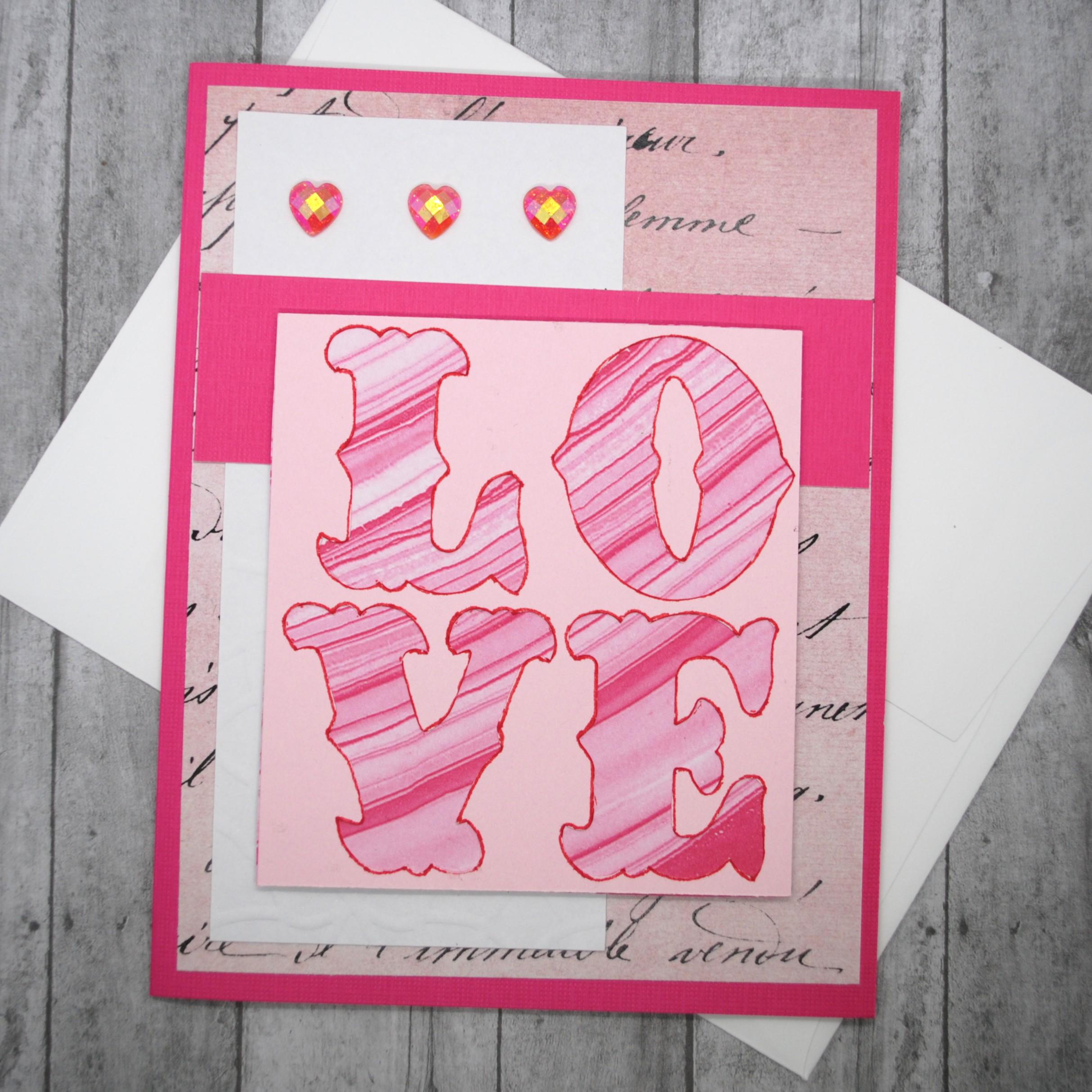 Pretty love-themed card perfect for Valentine's, anniversary, or just because. Features "LOVE" in big letters with red and pink striped pattern behind it.