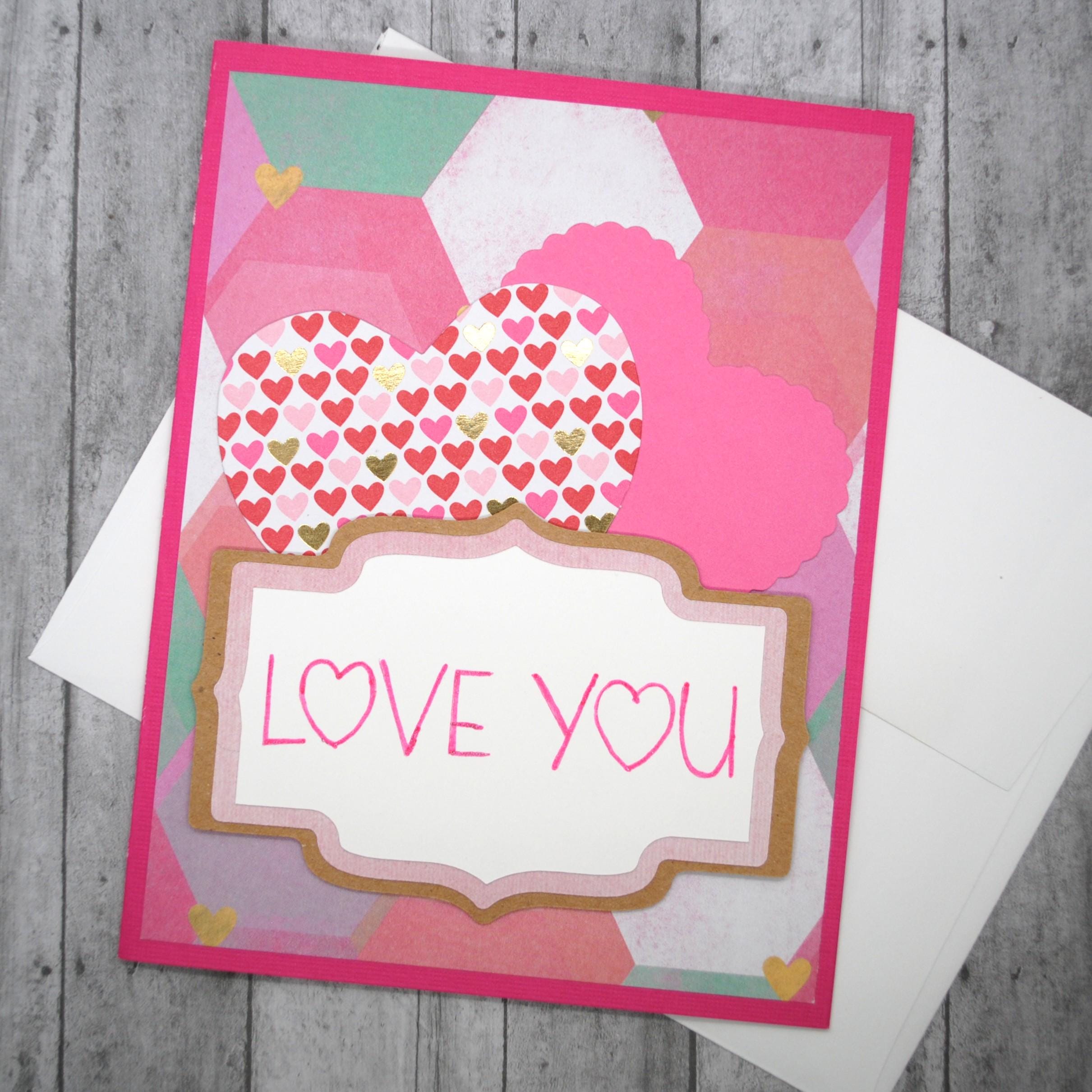 Pretty love-themed card perfect for Valentine's, anniversary, or just because. Features "love you" on layered hearts and pink & white honeycomb pattern background.