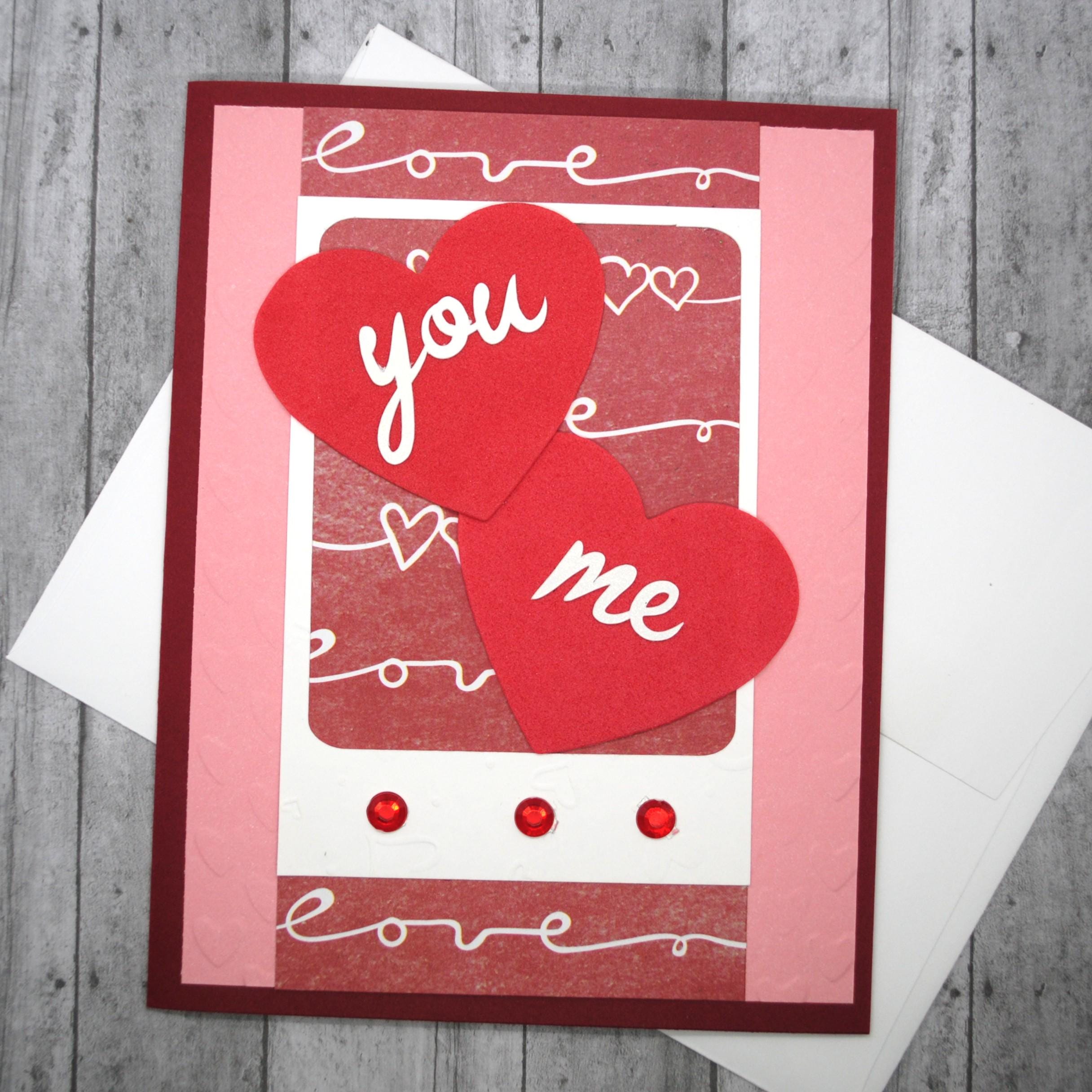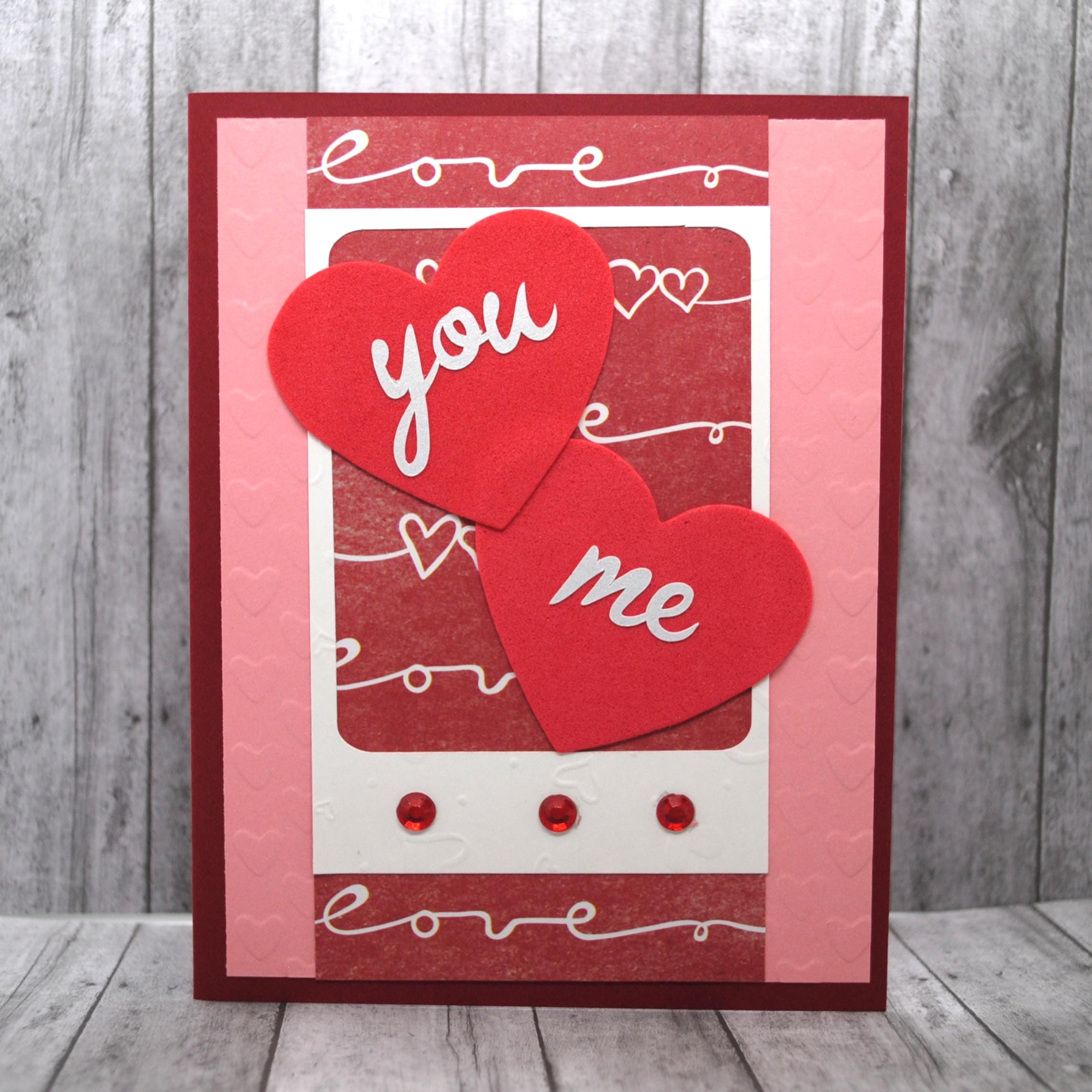 Cute love-themed card perfect for Valentine's, anniversary, or just because. Features foam red hearts with "you" and "me" on a white embossed frame. Background is dusty rose cardstock embossed with hearts.