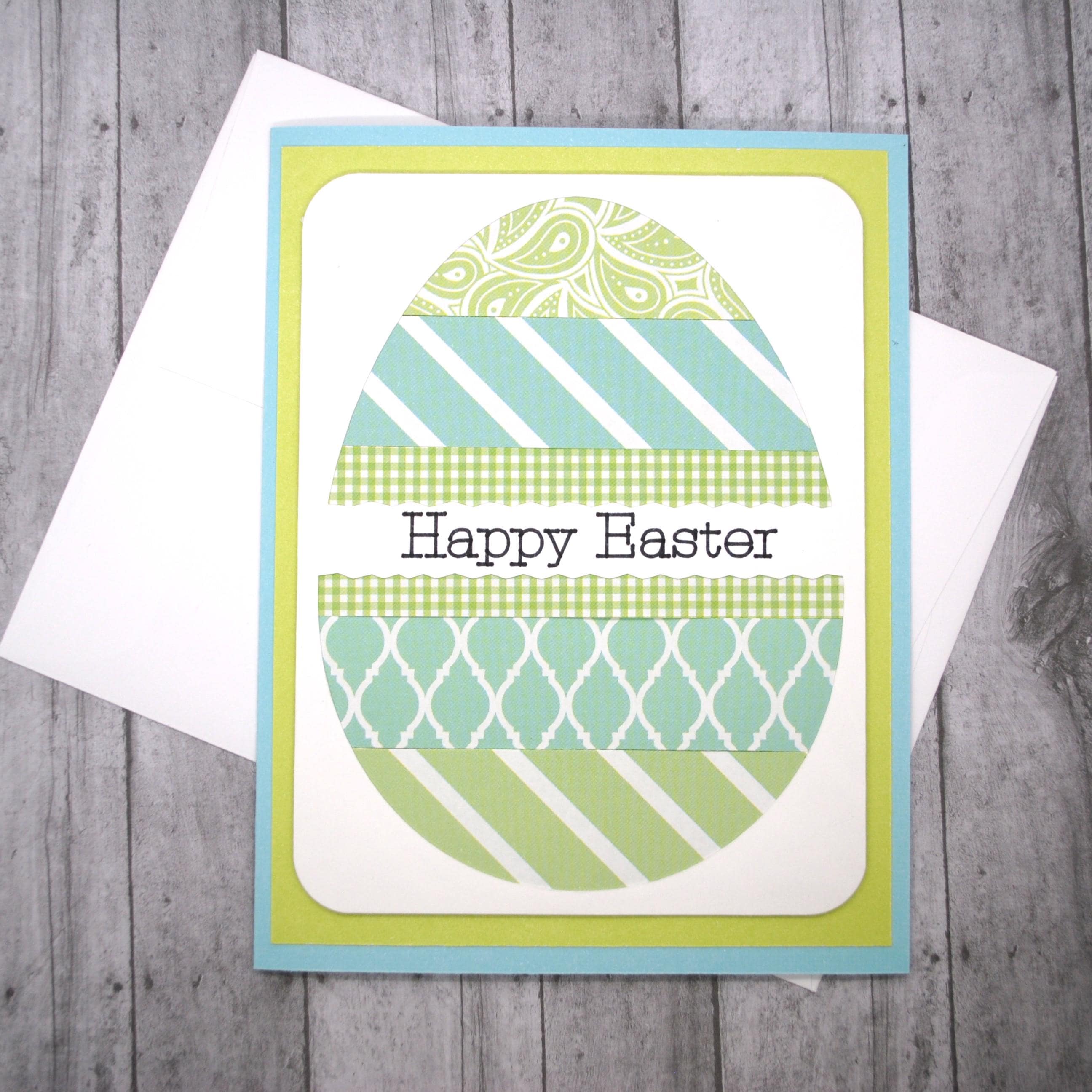 Pretty decorated egg perfect for a simple Easter greeting. Features a large egg shape with layers of patterned paper in shades of blue and green. "Heppy Easter" is printed in the middle.