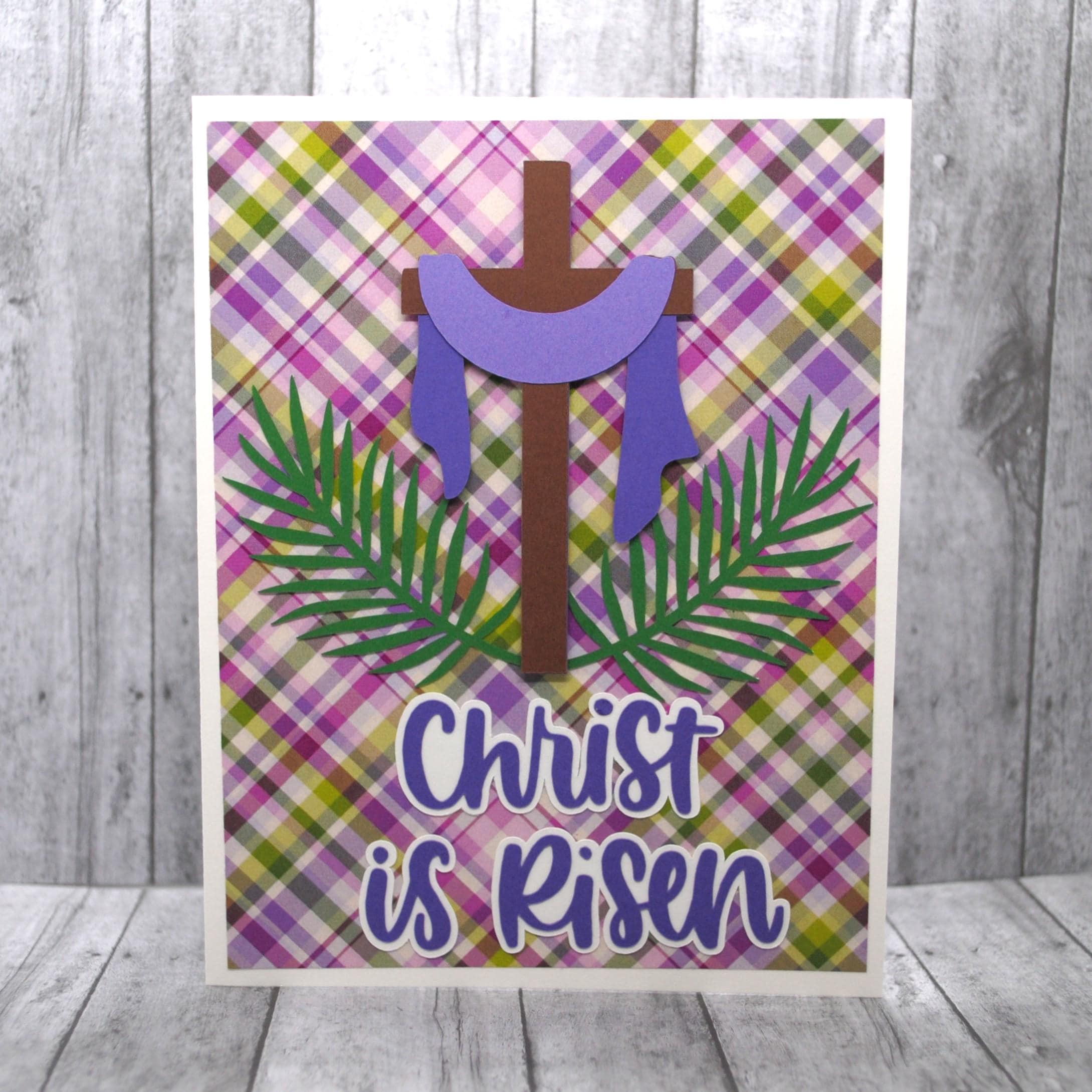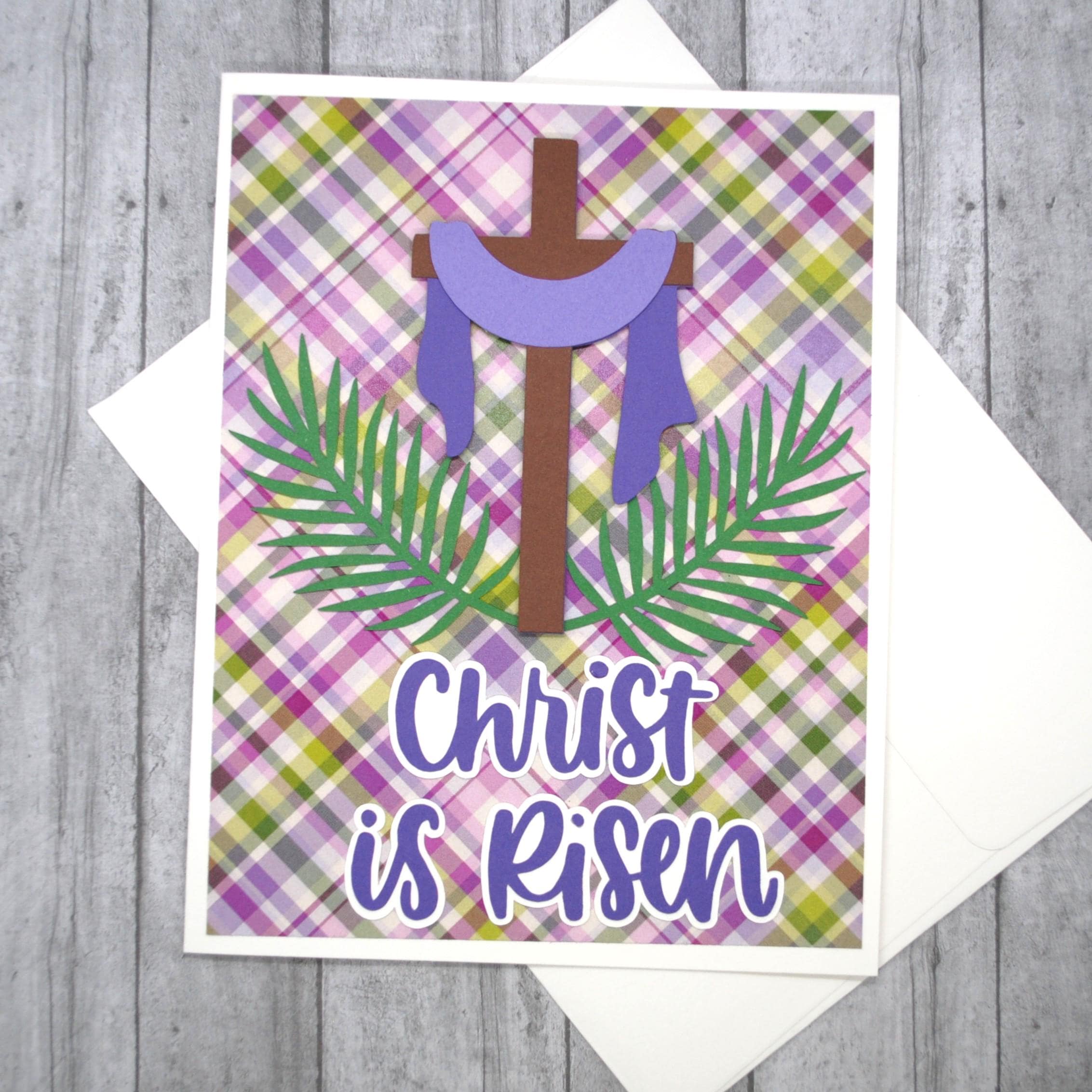 Celebrate that Chris is Risen with this pretty religious Easter card, featuring a cross draped with purple cloth, and palm leaves at the base. Comes with a cream paper envelope.